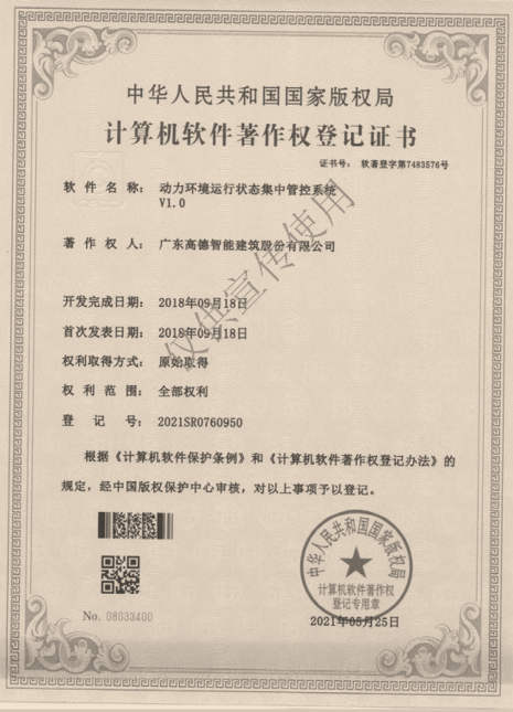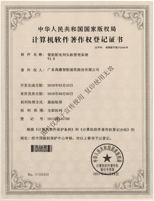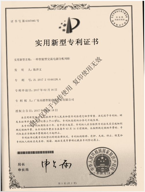 多功能智能控制配電柜證書